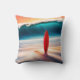 Rechtop oranje surfplank op een zonsopgang strand met oceaan golf.