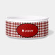 Stijlvol hondengerecht, met afbeeldingen van een rode en witte gingham band, rond het gerecht, en een zwart-wit rood-ovalstekstgebied, in het midden voor de naam van je huisdier. De witte douanetekst staat u toe om met de naam van uw huisdier aan te passen, voor een gepersonaliseerde kom uw hond kan trots zijn op. Het maakt een geweldig cadeauidee.