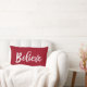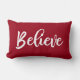 Geloof handschrift | Vakantie Sierkussen in het rood. Moderne boerderij typografie ontwerp door Blackberry Boulevard "Believe" geschreven in een wit schrift lettertype op een effen rode kleur achtergrond. Andere kleuren beschikbaar in de winkel. Perfect accentkussen voor uw vakantiehuisinrichting.