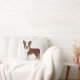 Destei's originele cartoon illustratie van een schattige rode en witte jas kleur van het Boston Terrier-ras. De achtergrond heeft een patroon van grijze hondenpootafdrukken.