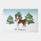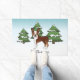 Destei's originele cartoon illustratie van een schattige rode en witte kleur van het Boston Terrier-ras. De hond wordt in een winterscène geplaatst met drie groene veer en vallende sneeuw. De achtergrond is een blauw tot witte gradiënt die het ontwerp geeft dat de koude winterdag eruit ziet. Er is ook een personaliseerbaar tekstgebied voor een naam.
