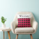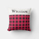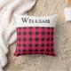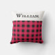 Een stijlvol werpkussen voor een bed, stoel of bank, patterend met een klassiek buffelplaid ontwerp in rood en zwart. Bovenaan staat een witte band, met je gekozen naam in zwarte hoofdletters. Het buffelcontrolekussen is een aantrekkelijk en nuttig gepersonaliseerd cadeau voor vrienden, familie en collega's, met Kerstmis en het hele jaar door.