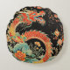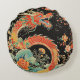 Dit ronde kussen heeft een rode draak in Aziatische stijl en bloemen op een zwarte achtergrond.
