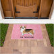 Destei's originele cartoon illustratie van een roodharige driekleurige vachtkleur Pembroke Welsh Corgi rashond op een roze achtergrondkleur met een hartenpatroon in verschillende maten. Onder het afbeelding van de hond is er een personaliseerbare tekst voor een familienaam of andere aangepaste tekst zoals "welkom", bijvoorbeeld.