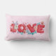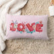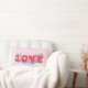 Een kussen met Liefde, geschreven in een gewaagd blokachtige lettertype omringd door mooie bloemen. Creëer met waterverven. Licht roze gepatterde achtergrond.