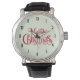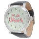 Een horloge met een fancy typografisch ontwerp met een feestelijk lettertype in het rood, dat Zuurzame Kerstmis zegt.