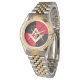 Stijlvol gouden vierkant en compass Masonic symbool met een zwart en rood gepersonaliseerd horloge op de achtergrond.