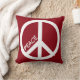 Een rode kussen met een groot wit vredesteken en aanpasbare tekst. Houd het woord rust of voeg in plaats daarvan een naam toe!