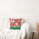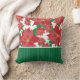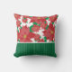 Rode poinsettia kerstkussen. Het onderste gedeelte is verticale witte instripes op een donkergroene achtergrond en het bovenste gedeelte is rode punsettias.