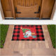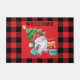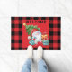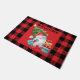 Cute gnome met kerstboom en cadeaudozen over zwarte en rode buffelvlecht