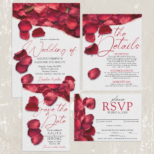 Wedding invitation designed with beautiful red rose petals to symbolize romantic love. Easy personalization can be done using Zazzle's template so you can change to sample text for your own. Say hello via Zazzle chat with any assistance, questions, or comments. For more curiously creative creations shop www.zazzle.com/paperieblooms/collections and follow instagram.com/paperie_blooms
