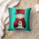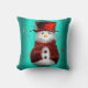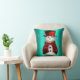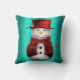 Een kleurrijk kerstkussen met een schattig snowman, gekleed in een rode fluwelen pet en vest op een metalen blauwgroen (of aqua) achtergrond. Dit mooie kerstkussen zal elk huis oplichten voor de feestdagen.