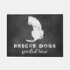 "Reddingshonden hier gespoeld", schattig puppy silhouet en tekst die in een krijstijl op een zwarte achtergrond is gemaakt.