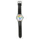 Dit horloge heeft een grafisch afbeelding van de aarde met het werelddeel van Noord-Amerika, Zuid-Amerika, Afrika en Europa. Ze zitten in regenboogkleuren beginnend met rood in het noorden groen langs het midden en blauw en paarse in het zuiden. Het is een opvallende toevoeging aan elke arm, waar je een verklaring wilt afleggen. De algemene achtergrond is wit.