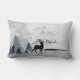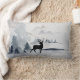 Kussen met een waterverf afbeelding met een zwart silhouet rendieren staan tussen sommige dennenbomen. Grijs zwart-wit neutraal kleurenschema.