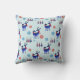 Een kussen met een herhalingspatroon. Illustratief: een blauw scandinavisch hert met rode sjaal. Met decoratieve markeringen op hun lichaam. Naast een trio van rode en blauwe kerstbomen met een ster boven. Fancy sneeuwvlokken stroomden rond.