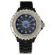 Hip 1950's ogend horlogegezicht met een origineel digitaal schilderij van 12 glanzende, plastic ogende maagdenpalmblauwe ballen bevestigd aan 12 zilverachtige staven op een zwarte achtergrond. Afgekapt met 2 aangepaste tekstvelden voor uw initialen.