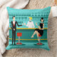 Elk uur is gelukkig met dit Retro Cocktail Lounge Sierkussen. Het moderne design uit de middelste eeuw is voorzien van een levendige stijl van 1960, minimalistische, cartoon tekening van een klasbare, cocktailbar. Tegen de achtergrond van een watermuur kunnen we rijen drink glazen zien. We kunnen tenminste de blauwgroen silhouetten van een drink bril zien. Afgaande op de vormen van de stengels, is deze bar goed uitgerust om uw fluitje te nat, ongeacht uw voorkeur voor drink. Een bekwame en persoonlijkste barman bemannen de blauwgroen bar met gele accenten. De jonge jachthaver draagt een pristine, wit shirt met zwart boegstropdas. Zijn frisse blik, blond haar en zwarte hipsterbril geven ons alle reden om te geloven dat hij zijn dagen doorbrengt als een worstelende acteur of een superheld. Aan de ene kant geeft de knappe mixoloog een martini aan een klant aan de andere kant van de balk. De wachtende klant is een breed gedragen heer in een zwart pak en rood stropdas. Hij is het soort man die beschreven wordt als groot, donker en knap zelfs als het nog uren is tot de sluitingstijd. Er lijkt een rode en chrome stool te zijn met de naam van de heer Debonair. Toch stelt hij, om niet te presumptief te zijn, de vraag: "Pardon, ik ben het niet eens. Is deze stoel genomen?" Hij vraagt aan de raven geharreerd meisje op de naburige stool. Ze is een echt "meisje van de volgende deur" type, als je naast een onberispelijke schoonheid leeft met een getal dat niet zal stoppen. Ze draagt een zwarte jurk en houdt met één hand een martini vast. Ze hoopt dat ze en de komende heer meer gemeen hebben dat hun voorkeur voor drink en de keuze van de wardrobe kleur. Het lijkt erop dat het vanavond net interessant werd. Proost op jou!