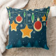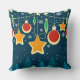 Een feestelijke retro kerstscène met rode, groene en gouden ornamenten die uit mousserende, bonte tuinen hangen, op een sneeuwige koninklijke blauwe achtergrond met lichtblauwe dennenbomen. Wees dit jaar een beetje creatief met je cadeautje en geef met deze heerlijk verschillende kussen. Ideaal voor een vriend die een ontwerpfan is, of een familielid die misschien nog in leven is op een vakantie van 1950 of 60. Of cadeau aan jezelf om je decor pop te maken.