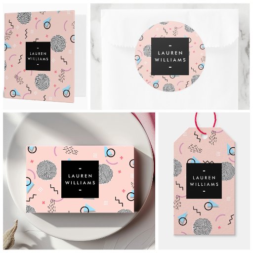 Een retro-geïnspireerd Memphis stijlpatroon van 1201AM® voegt persoonlijkheid toe aan dit gepersonaliseerde 80's thema sticker ontwerp. Personaliseer met jouw naam of bedrijfsnaam voor een onmiddellijke logo. Ideaal voor mode stylisten, artiesten, designers, party/event planners, of voor het personaliseren van kantoor of schoolspullen. Originele kunst en design © 1201AM Design Studio | www.1201am.com