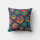 Retro Geometric Vibes Throw Pillow. A lively abstract pattern with colorful triangles and circles in blue, pink, yellow, green, orange, and red on a dark background.