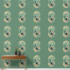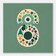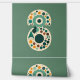 Een levendig geometrisch kunstwerk met cirkelvormige patronen in tinten van blauwgroen, sinaasappel en bruin. Het retro-ontwerp heeft een gevoel met speelse vormen en een minimalistisch boomelement in het onderste gedeelte.