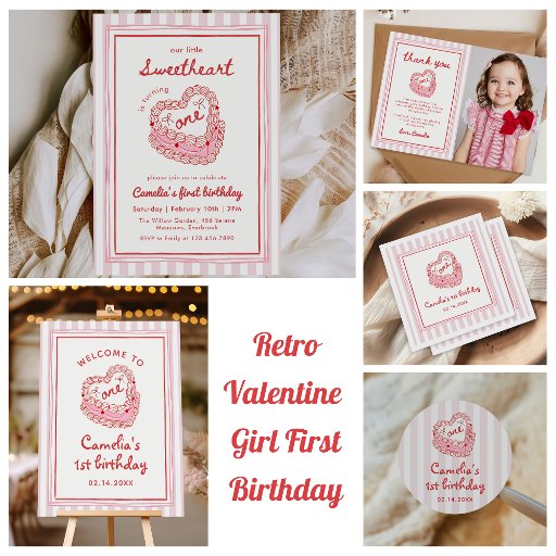 Retro Hand Drawn Valentine Girl First Birthday Invitation