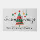 Retrostijlkleurige kerstboom met hangende ornamenten bovenrand. Pas aan met uw eigen vakantiegroet en naam of namen of speciaal bericht van uw bedrijf of groep.