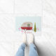 Een doormat met een illustratie van een traditionele reiskamperaanhangwagen omringd door roze flamingos, sneeuw en een kerstboom. Rode kamper is versierd met grote en kleurrijke kerstlichten. Pas de naam aan.