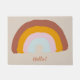 Creëer Een welkomstmat met een aantal goede vibes. Deze deurmat is voorzien van een handgetekende doodle stijl illustratie van een regenboog in mellow, retro kleuren van roest rood, goudkleurig sinaasappel, bleek roze en lichtblauw het is klaar om te worden gepersonaliseerd met een naam of aangepast met uw eigen boodschap.