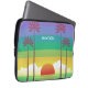 Modern colorful personalised laptop sleeve with retro style sunset and palm trees art.