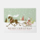 Leuke kleurrijke retro vrolijke kerst illustratie. Bruin koraal wit en lichtgroen kleuren rendieren santa rushing true de sneeuw. -MERRY KERSTMIS- en familienaam en werd opgericht. Perfect voor het kerstseizoen.