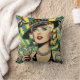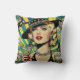 Image is a vibrant pop art illustration featuring a central female figure with fair skin and bright blue eyes, wearing a wide-brimmed hat adorned with stars.