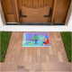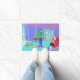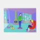 Brrr... Deze Retro Ski Vakantie Door Mat laat je rondkijken voor een Sint Bernard met een vat brandewijn. De middeleeuwse cartoon tekening is voorzien van een glamoureus stel opgehoopt in een kleurrijk skichalet met een prachtig uitzicht. De kamer heeft een turquoise vloer en paarse wanden. Hé, het zijn de jaren '60! De ramen van vloer tot plafond onthullen besneeuwde bergen, een turquoise hemel met lichtblauwe wolken en de silhouetten van gelukkige mensen die voorbij zoeven in skilift gondels. In de kamer zien we een olijfgroene, kegelvormige open haard met een gloeiend vuur. Op de grond liggen twee gele ski's naast skistokken. In het midden van de kamer draagt een knap man met zwart haar een blauwe broek en een groene coltrui. Hij draagt een dienblad met martinis. Eén arm is gestrekt en biedt een martini aan de wachtende hand van een blonde vrouw. De vrouw, zit in een rode, eierstoel. Ze draagt een marineblauwe broek en een hete roze trui. Excuseer haar dat ze niet opstaat, maar ze heeft een cast op één been!