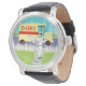 Als je een dorst hebt voor een modern design uit de midden eeuw, dan is deze Retro Small Town Milkman Watch voor je! In de stijl van 1960, minimalistisch kunstontwerp is een toegewijde milkman te zien die zijn ochtendrondes maakt. Het blonde man draagt een melkwitte broek, een shirt en een pet met een zwarte boeg stropdas, een gordel en schoenen. Dit man calcium en vitamine D wordt op een voorkant gespoten, met een wekelijkse voorraad gezonde, verse melk van een familie in glazen flessen. De ochtendkrant staat nog steeds op de stoep. Maak je geen zorgen. Alleen goed nieuws is toegestaan in deze stad. De stoep is omgeven door het soort groengras dat alleen in kleine steden en voorsteden voorkomt. Er is ook een wit, korenhek. In de straat zien we de milkman's zoete ritje. Het is een griezelige gele melktruck met een rode streep aan de zijkant en rode letters die zeggen: "DAIRY". Aan de andere kant van de straat zien we een aqualucht en de lichtblauwe silhouettes van cedar-bomen. Deze kitschy cartoon ziet eruit als een scène uit een oude tv-sitcom. Breng de gele cake op met chocolade uit de pan - de officiële taart van alle televisiehuisvrouwen en hun gelukkige gezinnen! Het bouwen van sterke botten heeft nooit zo goed geproefd.