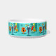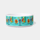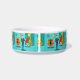 Schat, ik ben thuis! Deze Retro Space Age Cartoon Couple Pet Bowl zal je jaloers laten voelen op het cartoon paar op een dierenkom! Het herhalende, omwikkelde ontwerp heeft een turquoise achtergrond met blauwgroen stenen en een olijfgroene, kegelvormige open haard. Een strakke, zwarte poes zit op een strakke oranje stoel. Er is een blauwgroen, stervormige wandklok en een tweedelige hanglamp in de tinten geel, blauw en zwart. Voor en in het midden is er een vooraanstaande, martini-swilling-zakenman in een blauw pak en oranje stropdas. Aan zijn zijde draagt zijn blonde bombshell van een trofee vrouw een rode wiebeljurk en houdt een dienblad van martinis. Va-va-va-voom!