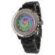 Dit groovy horlogeontwerp heeft een felle, wervelende regenboog van kleuren in een stropdas geverfd patroon. Het is een leuk, retro ontwerp voor vredelievende hippies / bohemians die houden van de jaren 60, 70 en psychedelische kleur. De nummers op het horloge zijn een regenboog van kleur met een zwarte omtrek.