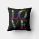 Groovy gooi kussen heeft retro stijl tie dye gestapeld "Love" letters op zwarte achtergrond