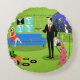 Deze Retro Urban-kerstparing-ronde Pillow is voorzien van een cartoon tekening van een elegant penthouse appartement dat allemaal gedecoreerd is voor de feestdagen met kleurrijke kerstlichten en een kitschy, roze, kerstboom, compleet met blauwgroen siervoorwerpen en een gele ster. Het appartement heeft een groene vloer en een groene bakstenen muur. Op de muur zijn vier Klassieke Drukken van het Canvas van de Film Martini Verretched, ook beschikbaar bij de opslag Zazzle van StrangeLittleOnion (wenk, wenk!). Drie van de prints hebben een turkooisachtergrond en een is op een zwarte achtergrond. Onder het schilderwerk is een blauwe, moderne sofa uit de middelste eeuw. Een verfijnde, ravenharige schoonheid zit op de bank. Ze draagt een levendige rode jurk en een kersthoed. Aan de ene kant houdt ze een bolletje mistletoe vast, gebonden met een rode boog. Aan de andere kant van de kamer is er een suave, groot, donker, en knap man. Hij draagt een zwart pak, wit shirt en rood stropdas. Aan de ene kant heeft hij een vinylplaat, en aan de andere kant houdt hij een leuk album cover. Op de vloer is er een oranje tomaan met een groene en zwarte platenspeler. Tegen de ottoman is een andere albumomslag voorzien van een verslag dat uit de kant uitrolt. Er zijn ook drie kleurrijke vinylalbums verspreid over de vloer. Achter het man zien we, door glijdende glazen deuren, sneeuw die valt op een groen balkon en de stad eronder. Een witte kat met een rode boog rond zijn nek is aan de rand van het balkon vastgeperst. Naast de kat is er een adembenemende skyline compleet met skyscrapers en een gele halve maan. De tegenovergestelde kant van de kussen heeft een leuk, groen baksteenpatroon. Als de andere helft zo leeft, teken me dan op!
