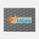 Aqua welkom met oranje en gele retro sterren op een grijze stervormige achtergrond.