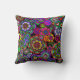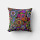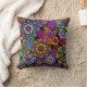 Een kussen met een levendige en kleurrijke vormgeving van vredesborden, paisley, ankhs, harten en bloemen. Een uitwijkflits terug naar de jaren '60.