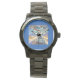 Je bekijkt een veganistisch polshorloge met een afbeelding van een memorabel nummer van een tijdje terug over accommodaties in Californië door Rick London op LTCartoons.com. Unisex sieraden.