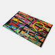 Dit portret heeft een modern ontwerp uit de midden eeuw van driehoeken en ringen in retrokleuren op een zwart veld.