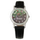 Persoonlijk horloge met een bijtende foto van een bruine houten tafel met speldeneconen, pijndennaalden, sneeuw en kerstversieringen. Festief en mooi.