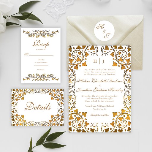 Deze stijlvolle en in het oog springende Rococo Elegant Classic Formal Wedding Invitation biedt prachtige kalligrafie en een verfijnd monogram, waardoor uw speciale dag een traditioneel tintje krijgt. Het elegante ontwerp wordt aangevuld met delicate gouden wijnstokken, waardoor een tijdloze look ontstaat die uw gasten zullen aanbidden. Of u nu een groot feest of een intieme bijeenkomst plant, deze stijlvolle uitnodiging balanceert zowel moderne trends als traditionele elegantie. Perfect voor een herfstbruiloft, het ontwerp zal uw trouwbriefpapier moeiteloos verheffen. Bestel de jouwe en maak uw trouwdag buitengewoon met onze prachtige florale uitnodiging.