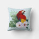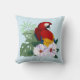 Een rode ara papegaai zittend tussen bloemen en bladeren in achtergrond van lichtblauw