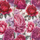 Rode rozen, bordeaux pioenen en lavendel lila maken samen een mooi, lief en romantisch, groot print behangpatroon.