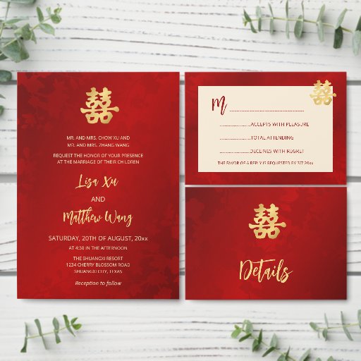 Deze elegante tweetalige Chinese trouwuitnodiging bevat een artistiek gouden dubbel gelukssymbool op een bloemige robijnrode glinsterende achtergrond. Namen van bruid en bruidegom in een elegant handgeschreven schrift. Chinese trouwuitnodiging of theeceremonie uitnodiging. Met jouw foto in het midden van de driezijdige trouwuitnodiging en een traditionele Chinese tekst aan de rechter binnenkant. Aan de achterkant staan de details en een scanbare QR-code voor jouw trouwwebsite.
