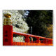 Witte kersenbloesem contrasteert met het vermiljoenrood van deze Japanse brug, waardoor een prachtige lentescène ontstaat. In Japan zijn rood en wit de kleuren van de viering.
