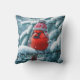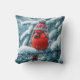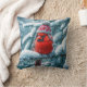 Een levendige rode kardinaal met een gebreid pet zit bovenop een met sneeuw bedekte groenblijvende tak, omringd door zachtjes vallende sneeuwvlokken